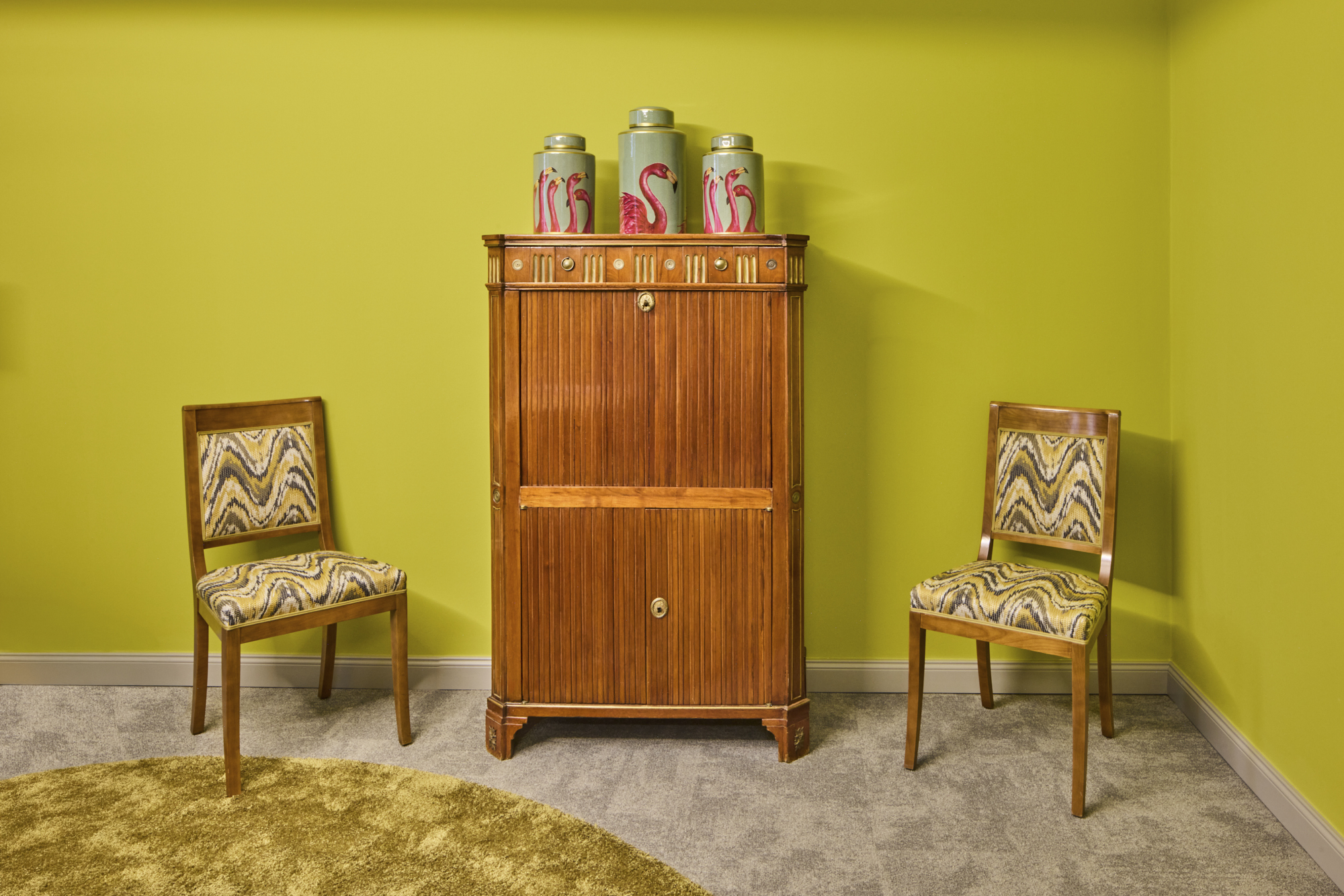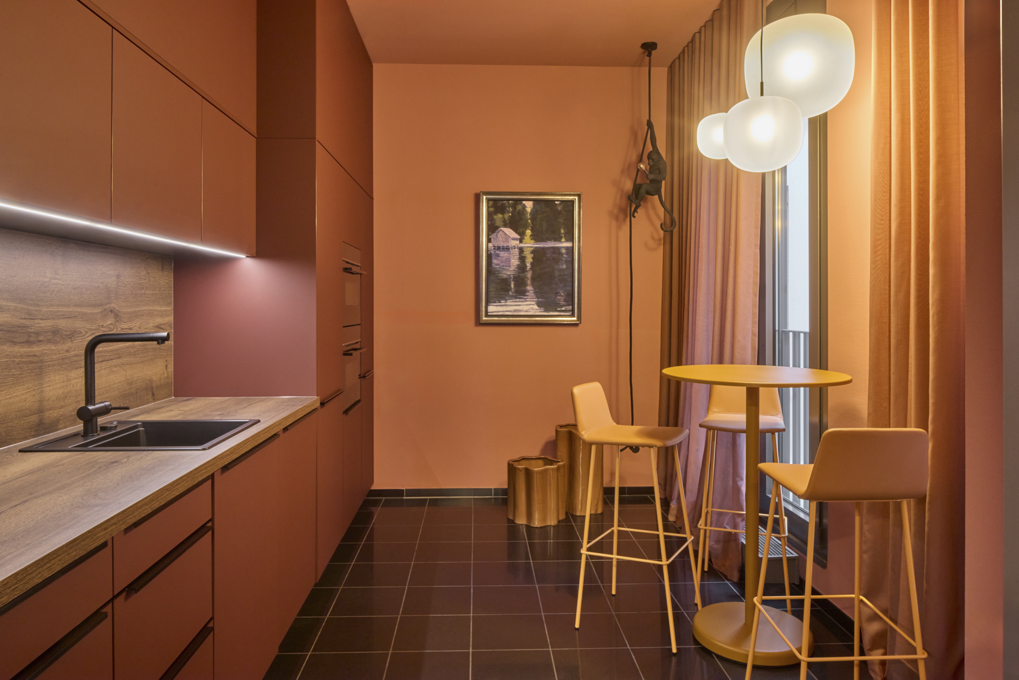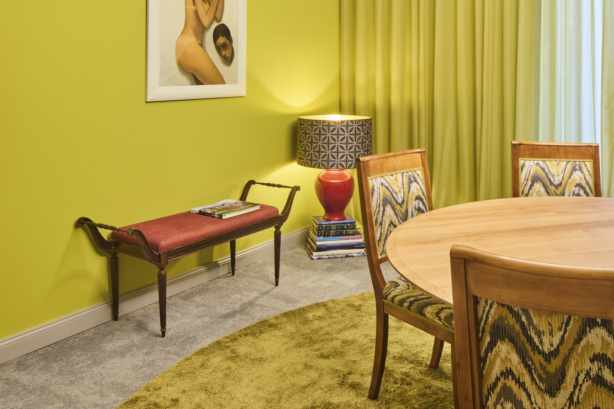 Für das Gestaltungskonzept stellte neotares Moderne und Tradition bewusst in einen spannungsvollen Dialog und kombinierte diese mit einem individuellen Farbkonzept. Grundlage bildete der Einsatz zahlreicher antiker Möbel, die durch neue Farben und Stoffe ins Heute geholt und mit modernen Elementen sowie einem innovativen Beleuchtungskonzept kontrastiert wurden. Liebevoll gestaltete Details wie eine kuratierte Galeriewand und abgestimmte Dekorationselemente verleihen den Räumen Persönlichkeit und Ausdruckskraft.